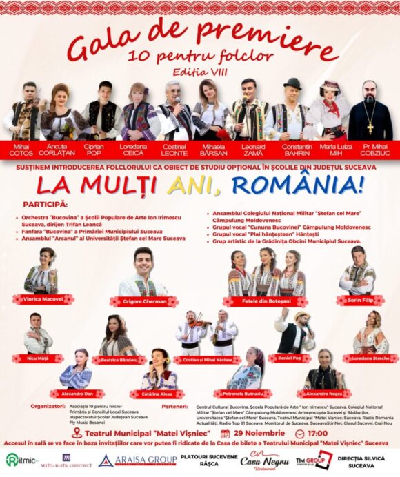 Proiectul ”10 pentru folclor” va avea anul acesta două spectacole de final, unul la Teatrul ”Matei Vișniec” din Suceava și celălalt la Casa de Cultură din Putna. Intrarea va fi gratuită la ambele spectacole, iar la Suceava, pentru a avea o evidență a numărului de spectatori, pentru ca nimeni să nu rămînă pe-afară, se vor elibera invitații la casieria teatrului. Inițiatoarea proiectului ajuns la cea de-a VIII-a ediție, Mihaela Zîna Bîrsan, a declarat în cadrul unei emisiuni la Radio Top că anul acesta, pe 29 și 30 noiembrie, vor urca pe scenă și membrii Fanfarei Primăriei Suceava. A spus Zîna Bîrsan: ”Nu știu de ce n-am remarcat pînă acum Fanfara Bucovina a Primăriei Municipiului Suceava. În momentul în care am văzut-o cum cîntă mi-am spus că trebuie să o aduc cumva la <10 pentru folclor>. Coordonatorul acestei fanfare, domnul Ghiocel Cioltan, este unul dintre cei mai apreciați muzicieni de-aici, de la noi, este și profesor la Școala Populară de Artă. M-am gîndit la un spectacol patriotic, care pentru prima dată se va desfășura în două localități, la Suceava și, deloc întîmplător, la Putna”. Mihaela Bîrsan a mai spus că datorită profesoarei Loredana Ceică, inspector de arte la Inspectoratul școlar Suceava, va susține recitaluri și Ansamblul Colegiului Național Militar ”Ștefan cel Mare” din Cîmpulung Moldovenesc.
