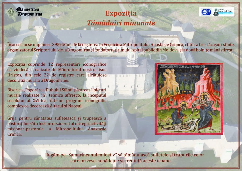 Mănăstirea Dragomirna în colaborare cu Spitalul Clinic Județean de Urgență „Sfîntul Ioan cel Nou” Suceava organizează expoziția itinerantă „Tămăduiri minunate”. Prima expoziție este găzduită de spital. Aceasta conține reproduceri iconografice din pildele biblice zugrăvite în fresca Bisericii „Pogorîrea Sfântului Duh” a mănăstirii de către ctitorul-artist Mitropolitul Anastasie Crimca. Expoziția are loc în contextul declarării anului 2024 ca An omagial al pastorației și îngrijirii bolnavilor și An comemorativ al tuturor Sfinților tămăduitori fără de arginți în Patriarhia Română și se desfășoară cu binecuvîntarea Înalt Prea Sfințitului Părinte Calinic, arhiepiscopul Sucevei și Rădăuților. Într-un comunicat al spitalului sucevean se mai arată: ”În acest an se împlinesc 395 de la nașterea în veșnicie a Mitropolitului Anastasie Crimca, ctitor a trei lăcașuri sfinte, organizatorul Scriptoriului (Școala de miniatură) de la Dragomirna și fondatorul primului spital public din Moldova și a două bolnițe mănăstirești. Biserica <Pogorîrea Duhului Sfânt> a Mănăstirii Dragomirna păstrează picturi murale realizate în tehnica affresco, la începutul secolului al XVI-lea, într-un program iconografic complex ce decorează Altarul și Naosul. Expoziția <Tămăduiri minunate> cuprinde 12 reprezentări iconografice cu vindecări realizate de Mîntuitorul nostru Iisus Hristos, din cele 22 de registre care alcătuiesc decorația murală a Dragomirnei. Acestea au fost expuse în interiorul Sălii de conferințe Dr. Vasile Andriu și pot fi vizionate timp de o lună”. Programul de vizitare a expoziției este zilnic între orele 10.00-14.00 și 16.00-18.00, cu excepția perioadelor cînd sala este ocupată cu activități ale spitalului.