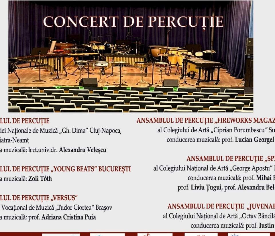 Participă la concert: Ansamblul de percuție al Academiei Naționale de Muzică „Gheorghe Dima” Cluj-Napoca – Extensia Piatra-Neamț, condus de lectorul universitar doctor Alexandru Veleșcu, Ansamblul de percuție „Versus” Brașov, conducerea muzicală profesor Adriana Cristina Puia, Ansamblul de percuție „Fireworks Magazin” Suceava, conducerea muzicală profesor Lucian Georgel Rusu, Ansamblul de percuție „Spirit” Bacău, conducerea muzicală profesor Mihai Bălan, profesor Liviu Țugui și profesor Alexandru Beldescu, și Ansamblul de percuție „Juvenartis” Iași, conducerea muzicală profesor Iustin Rusu.