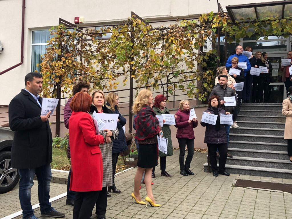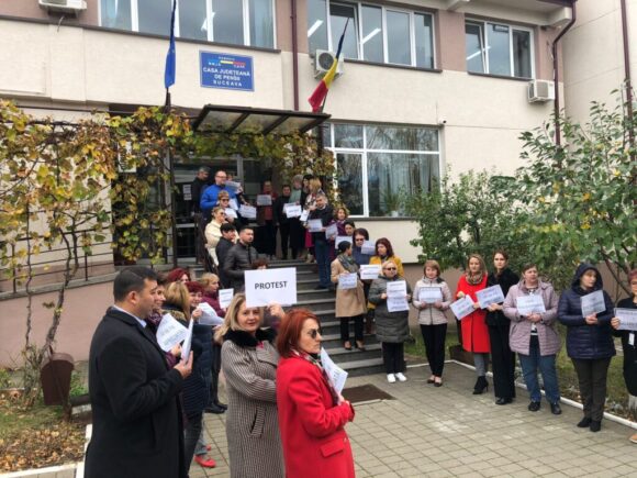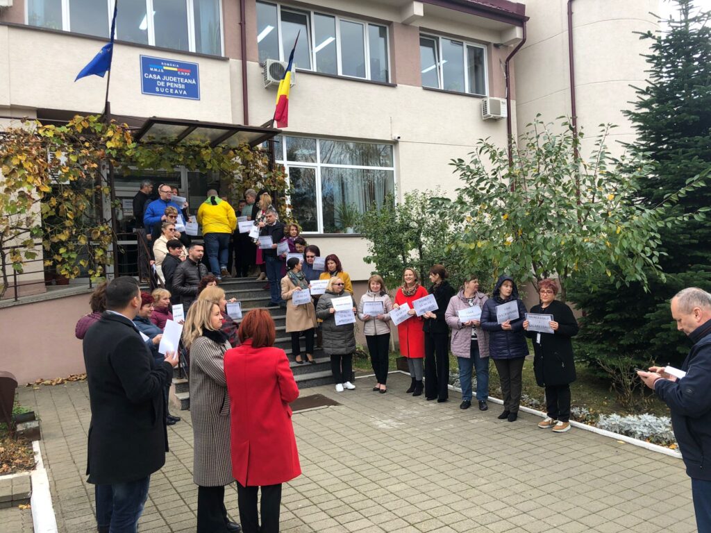 Cîteva zeci de angajați ai Casei de Pensii Suceava au protestat, astăzi, în intervalul orar 10.00-11.00, în fața instituției, însă activitățile cu publicul nu au fost suspendate. Acțiuni similare au avut loc în toată țara și vizează mărirea salariilor. Protestatarii de la Suceava purtau pancarte cu mesaje de genul <Munca să ne fie apreciată!>, <Fără discriminare!> sau <Muncă egală=Salarii egale>. Oamenii susțin că volumul de muncă a crescut foarte mult și cer ca salariile lor să fie aduse la același nivel cu cele ale colegilor din structura centrală. Ei afirmă că veniturile lor nu au mai suferit modificări de aproximativ șapte ani și că protestele se vor încheia doar atunci cînd le vor fi acceptate solicitările privind majorarea salarială.