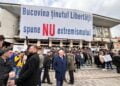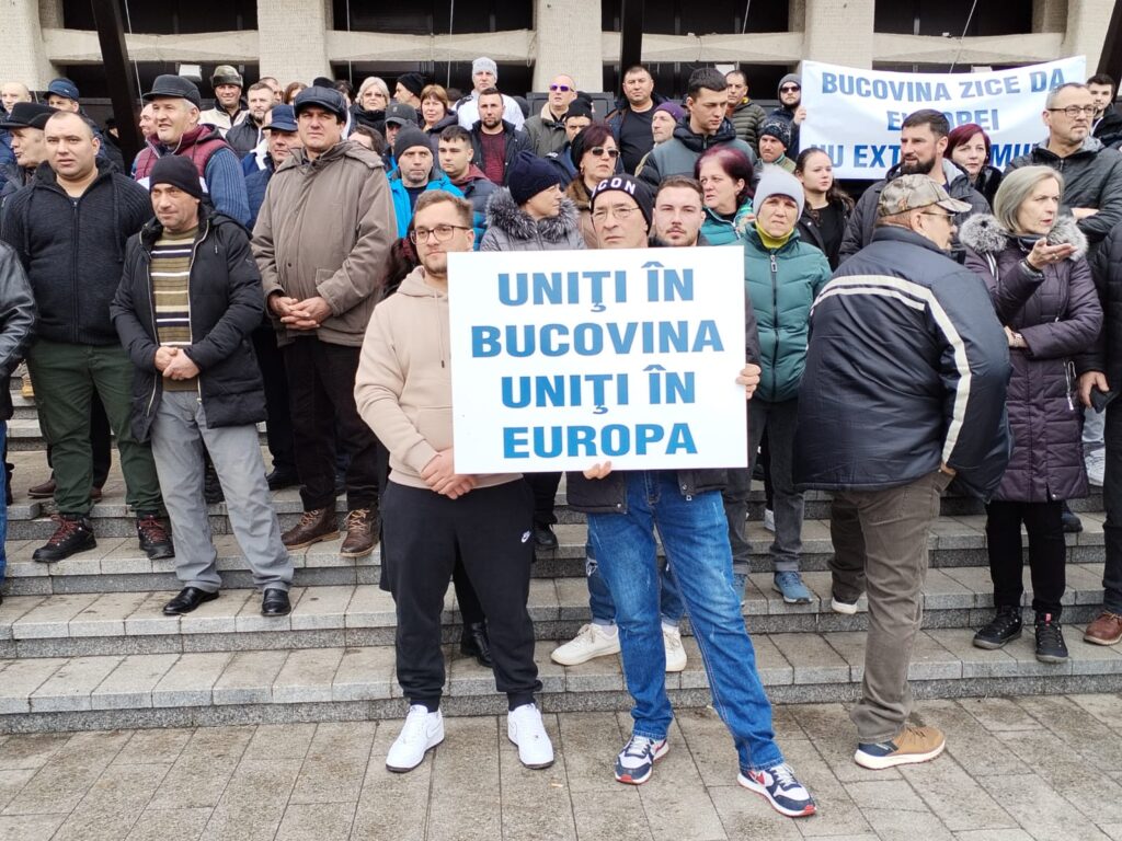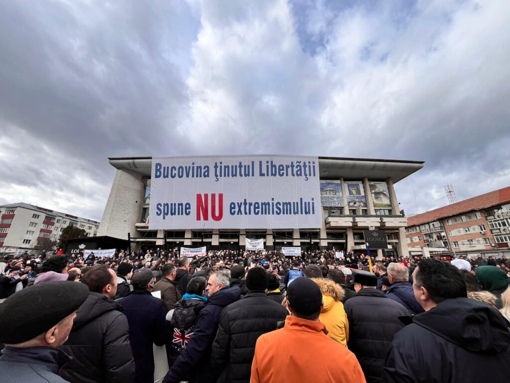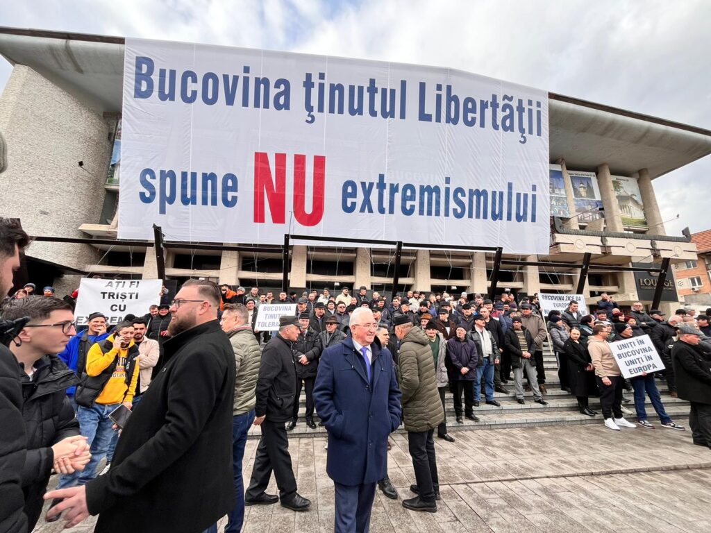 Cei prezenți aveau pancarte pe care scria ”Extremismul este refugiul incompetenților”, ”Bucovina ținutul toleranței” sau ”Bucovina zice da Europei, și nu extremismului”. Pe fațada Casei Culturii a fost afișat un banner uriaș pe care scria ”Bucovina ținutul Libertății spune NU extremismului”.
