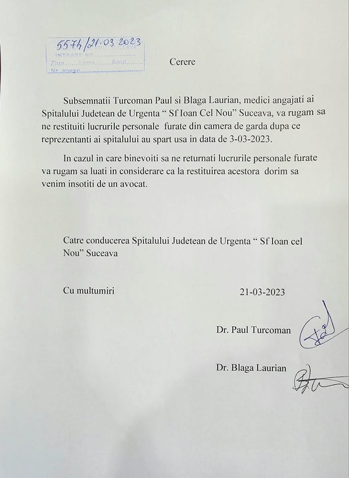 Pe pagina de Facebook ”Cardiologie intervențională” a fost publicată cererea prin care cardiologii intervenționiști Paul Turcoman și Laurian Blaga solicită conducerii Spitalului Județean Suceava să li se restituie bunurile pe care cei doi le aveau în cabinetul despre care spun că le-a fost spart în data de 3 martie. Sub titlul ”Au trecut 18 zile…” este publicată cererea cu numărul de înregistrare 5574 din 21 martie 2023 în care se arată: ”Subsemnații Turcoman Paul și Blaga Laurian, medici angajați ai Spitalului Județean de Urgență <Sf. Ioan cel Nou> Suceava, vă rugăm să ne restituiți lucrurile personale furate din camera de gardă, după ce reprezentanți ai spitalului au spart ușa în data de 03.03.2023. În cazul în care binevoiți să ne returnați lucrurile personale furate vă rugăm să luați în considerare că la restituirea acestora dorim să venim însoțiți de un avocat”. Cei doi medici nu mai sînt lăsați să facă intervenții, pentru că au refuzat să semneze fișa postului pe care le-o impune managerul spitalului, doctorul Alexandru Calancea.