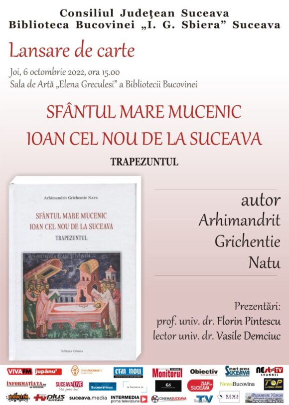 Joi, 6 octombrie, începînd cu ora 15.00, la Biblioteca Bucovinei <I. G. Sbiera> va fi lansată cartea „Sfîntul Mare Mucenic Ioan cel Nou de la Suceava – Trapezuntul”, scrisă de arhimandritul Grichentie Natu. Cartea a apărut la Editura „Crimca”, înființată de Arhiepiscopia Sucevei și Rădăuților. Lucrarea va fi prezentată de decanul Facultății de Istorie și Geografie din cadrul Universității <Ștefan cel Mare>, profesorul universitar doctor Florin Pintescu, și de lectorul universitar doctor Vasile Demciuc.