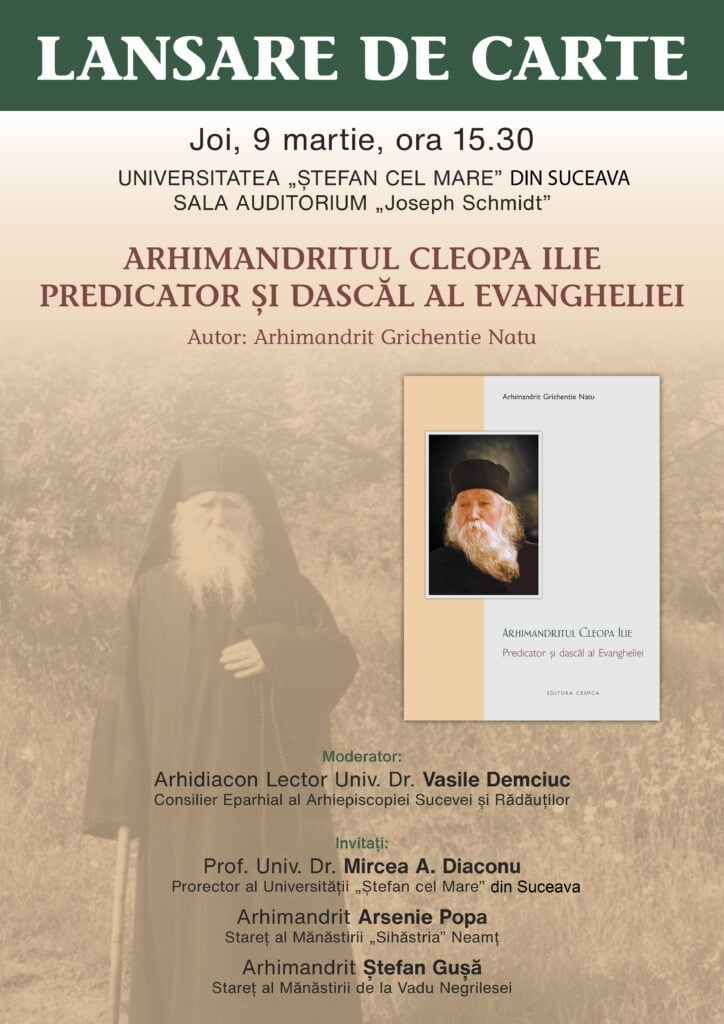 Joi, 9 martie, începînd cu ora 15.30, în Sala Auditorium „Joseph Schmidt” a Universității „Ștefan cel Mare” din Suceava va fi lansată cartea <Arhimandritul Cleopa Ilie, predicator și învățător al Evangheliei>, scrisă de arhimandritul Grichentie Gheorghe Natu. Evenimentul va fi moderat de  arhidiaconul lector universitar doctor Vasile Demciuc, consilier eparhial al Arhiepiscopiei Sucevei și Rădăuților și cadru didactic la USV, la Facultatea de Istorie și Geografie. Despre carte vor vorbi profesorul universitar doctor Mircea A. Diaconu, critic literar, eseist și filolog, arhimandritul Arsenie Popa, stareț al Mănăstirii „Sihăstria” din Neamț, și arhimandritul Ștefan Gușă, stareț al Mănăstirii de la Vadu Negrilesei – Stulpicani.