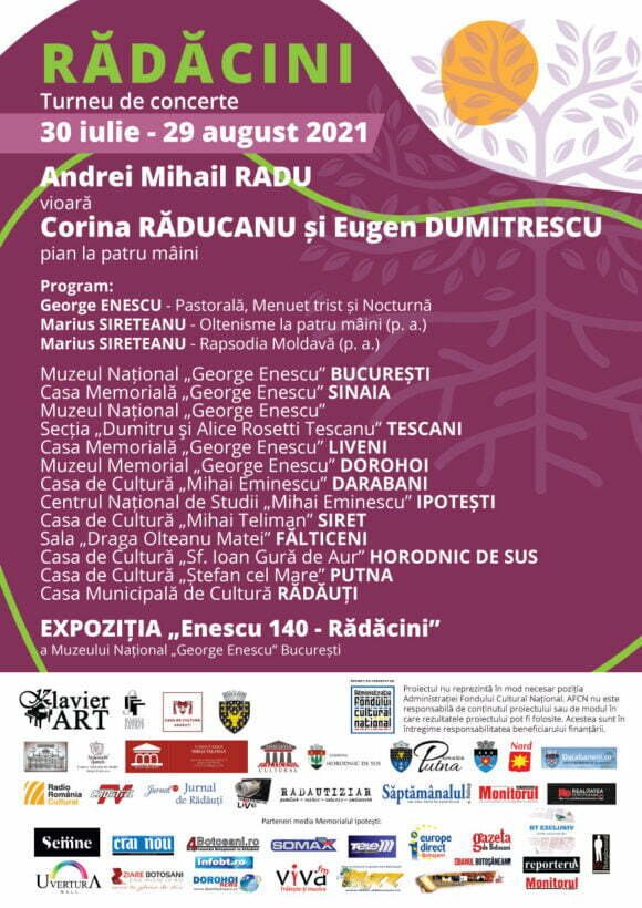 În cinci localități sucevene vor fi prezentate concerte camerale în organizarea Asociației Klavier ART. Directorul Centrului Cultural Siret, Ioan Mateiciuc, susține că turneul intitulat ”Rădăcini” va ajunge pe 25 august 2021 la Centrul Cultural „Mihai Teliman” Siret, pe 26 august 2021 la Sala „Draga Olteanu Matei” Fălticeni, pe 28 august 2021 la Casa de Cultură „Sf. Ioan Gură de Aur” Horodnic de Sus, iar pe 29 august la Casa de Cultură „Ștefan cel Mare” Putna și la Casa Municipală de Cultură Rădăuți. Turneul de concerte va avea loc cu plecare din București pe 30 iulie. Conform domnului Mateiciuc, „<Rădăcini> este turneul de concerte organizat de Asociația Klavier ART în perioada 30 iulie – 29 august 2021, cu scopul de a aduce muzica românească mai aproape de tineri, într-o tonalitate contemporană. Mai mult decît atît, în cadrul turneului organizatorii își doresc să valorifice, pe lîngă compoziții în primă audiție, o formulă camerală rar exploatată în România – vioară și pian la patru mîini”. Proiectul este co-finanțat de Administrația Fondului Cultural Național.