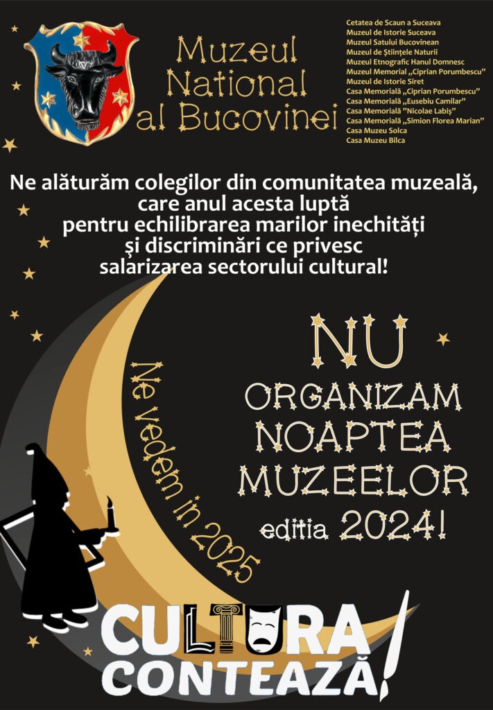 Muzeul Național al Bucovinei nu organizează anul acesta evenimentul ”Noaptea Europeană a Muzeelor”. Evenimentul este programat pentru data de 18 mai. Într-un comunicat al instituției conduse de doctorul în istorie Emil Ursu se arată: ”Astfel, ne alăturăm colegilor din comunitatea muzeală, care anul acesta luptă pentru echilibrarea marilor inechități și discriminări în ceea ce privește salarizarea sectorului cultural! Vă rugăm să înțelegeți protestul nostru, așteptîndu-vă să ne vizitați oricînd doriți, amintindu-vă de celelalte 14 zile cu acces gratuit în muzee, oferite de Muzeul Național al Bucovinei la obiectivele culturale pe care le administrează! Muzeul Național al Bucovinei marchează zile cu însemnătate istorică locală, națională și internațională, zile de naștere ale unor personalităților culturale al căror nume îl poartă muzeele, zile cu însemnătate socială, oferind posibilitatea diverselor categorii de public să viziteze gratuit, la datele stabilite, obiectivele muzeale pe care le administrează”.