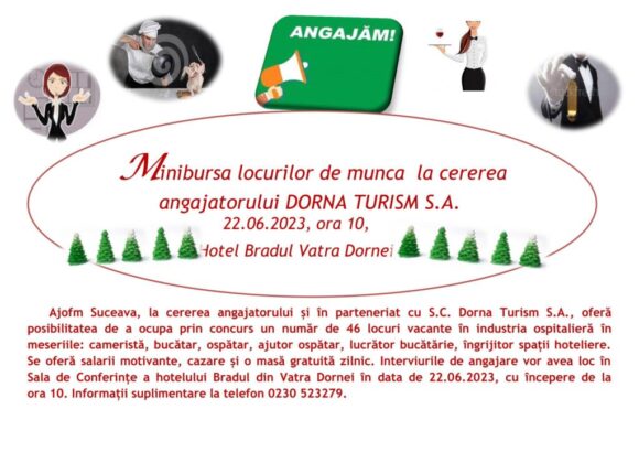 <Dorna Turism> S.A. dispune de 46 de posturi vacante în industria ospitalieră, iar acestea vor fi scoase la concurs joi, 22 iunie, începînd cu ora 10.00, la o bursă a locurilor de muncă programată în Sala de conferințe a Hotelului <Bradul> din Vatra Dornei. Acțiunea este organizată de AJOFM Suceava la cererea angajatorului. Conform instituției județene, posturile sînt de cameristă, bucătar, ospătar, ajutor de ospătar, lucrător în bucătărie și îngrijitor de spații hoteliere. Se oferă salarii motivante, cazare și o masă gratuită zilnic. Informații suplimentare pot fi obținute la numărul de telefon 0230/523279.