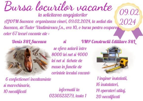 La solicitarea a două firme, Agenția Județeană a Forței de Muncă va organiza la sediul său din Suceava o bursă a locurilor de muncă vineri, 9 februarie, începînd cu ora 10.00. VMP Construcții Edilitare SRL are 51 de posturi, iar ”Denis” SRL Suceava are 16 posturi. Fabrica de încălțăminte ”Denis” angajează confecționeri și muncitori necalificați. Firma de construcții angajează ingineri instalații, operatori utilaj, instalatori și muncitori necalificați. VMP oferă cazare și bonuri de masă, iar salariile au valori cuprinse între 4.000 lei și 8.000 lei, net, funcție de experiență și calificare.