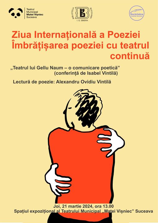 Teatrul Municipal „Matei Vișniec”, Societatea Scriitorilor Bucovineni și Biblioteca Bucovinei „I. G. Sbiera” vor sărbători Ziua Internațională a Poeziei pe 21 martie. Evenimentul va fi găzduit de spațiul expozițional al teatrului începînd cu ora 13.00. Pe parcursul acestuia va avea loc o conferință susținută de criticul literar Isabel Vintilă, inspector școlar pentru limba și literatura română, al cărei titlu este „Teatrul lui Gellu Naum – o comunicare poetică”. Totodată, Alexandru Ovidiu Vintilă, președintele Societății Scriitorilor Bucovineni și redactor șef al revistei „Bucovina literară”, va citi poezie.
