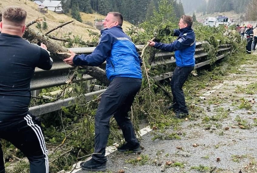 Jandarmii montani dorneni au contribuit la deblocarea Pasului Mestecăniș, unde căzuseră copaci rupți de vîntul puternic