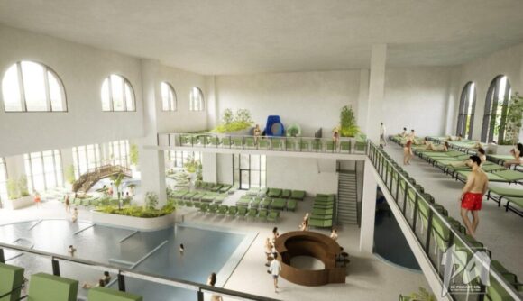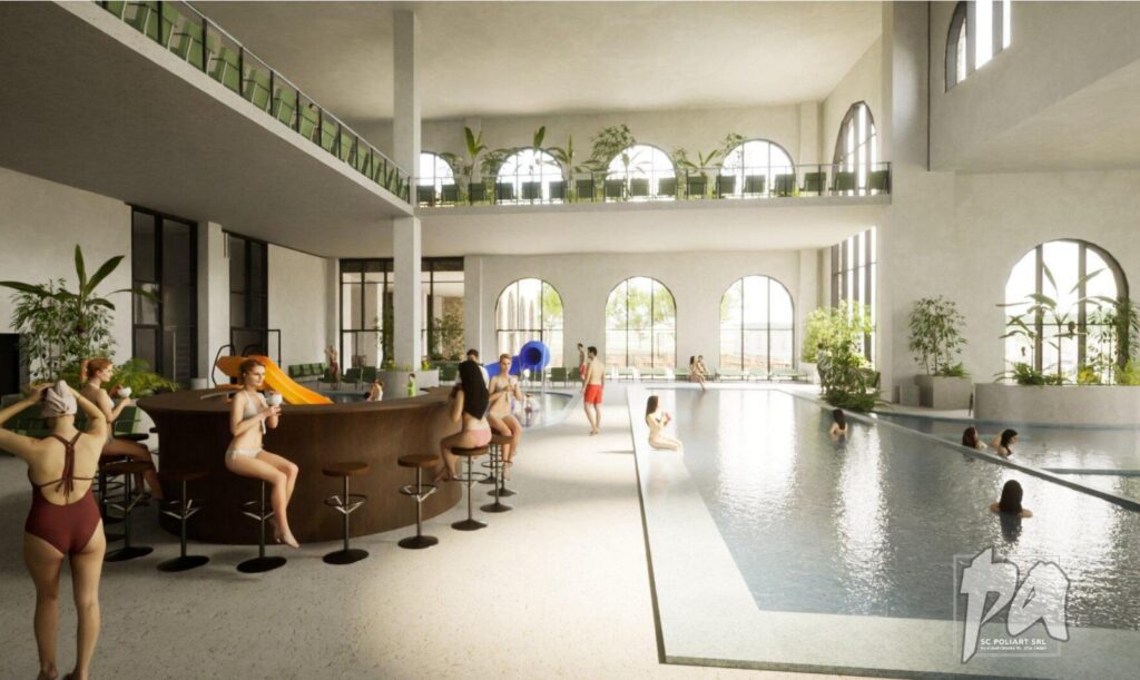 Pe diferența de 25.000 de metri pătrați vor fi amenajate: piscine exterioare; tobogane exterioare independente; plajă exterioară; bază observare pentru post salvamar; dușuri; grupuri sanitare; spații tehnice; locuri de parcare.