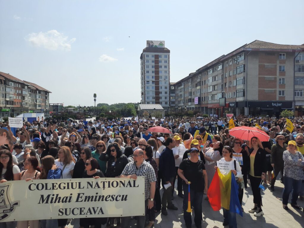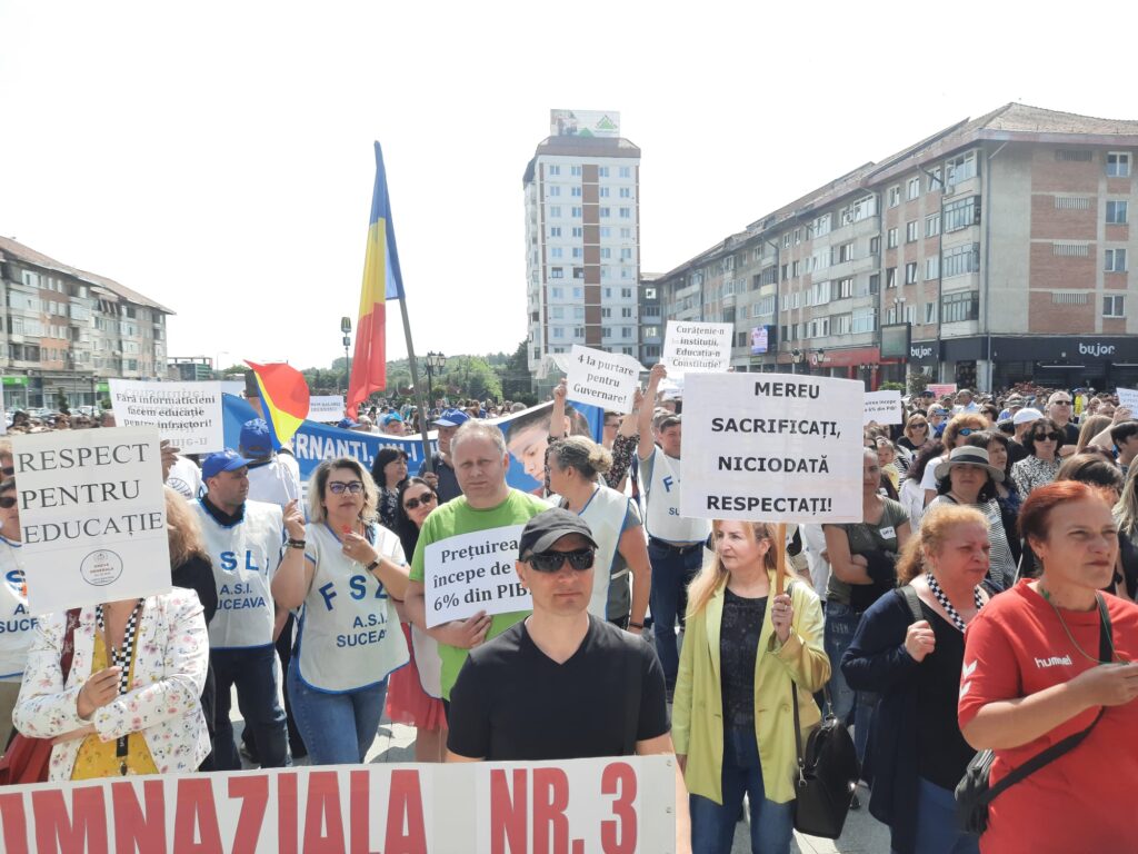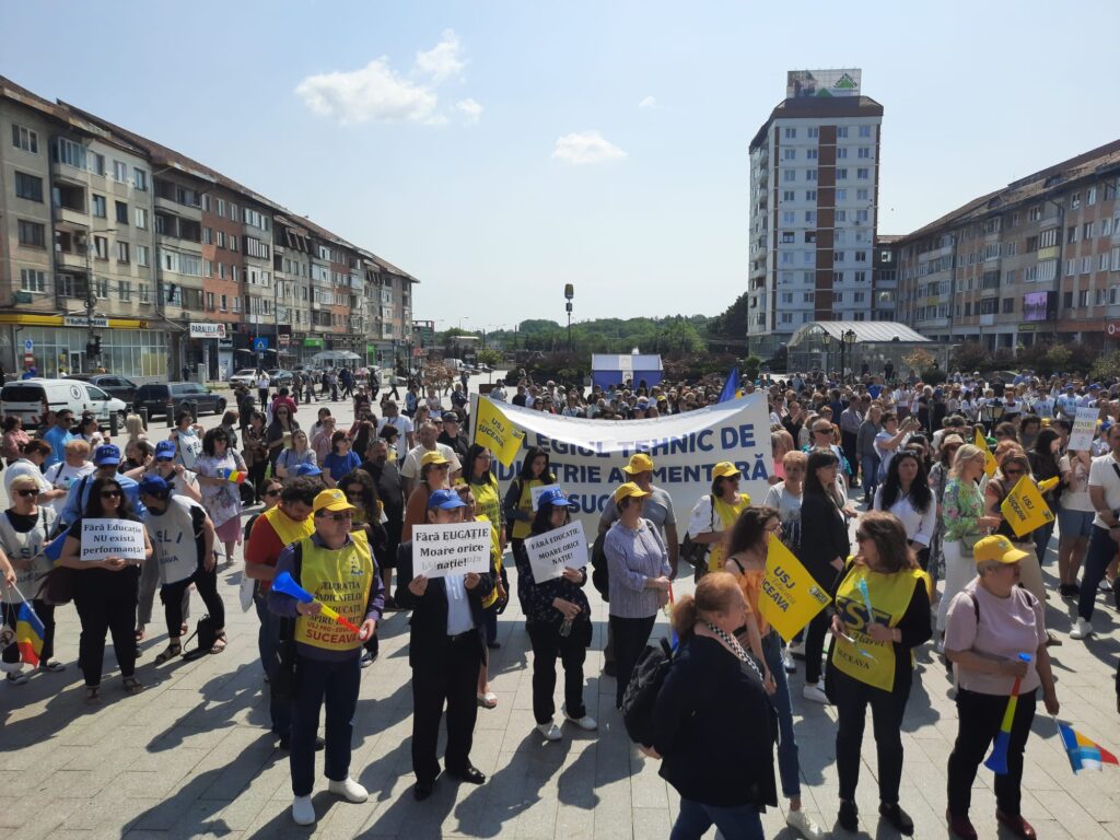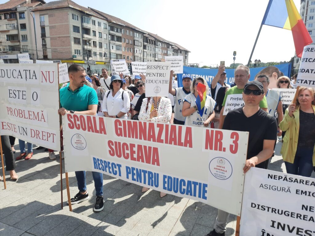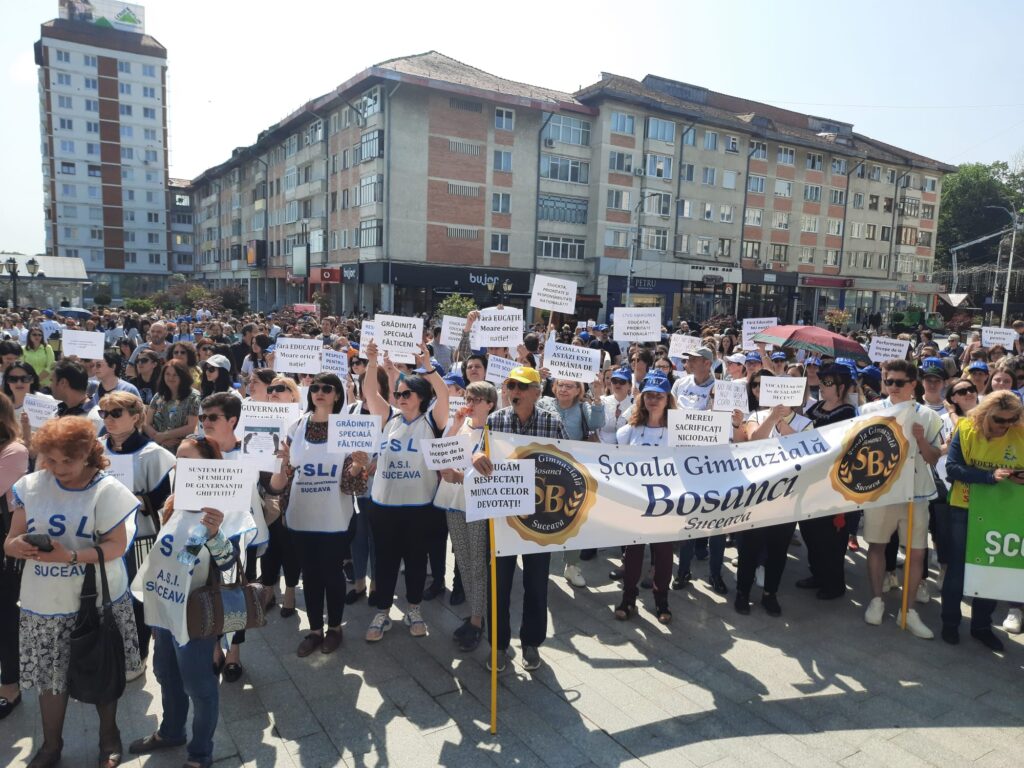 Cîteva mii de angajați din educație au protestat, astăzi, pentru a doua oară în ultimele zile pe esplanada Casei de Cultură din Suceava. Acțiunea are loc în cadrul grevei generale din învățămînt. La protest au participat angajați din unități precum Școala Gimnazială „Miron Costin” din Burdujeni, Școala Gimnazială nr. 3, Colegiul Economic <Dimitrie Cantemir> din Suceava, dar și de la școli din localități limitrofe municipiului reședință de județ. Protestatarii aveau pancarte cu mesaje de genul <Educația, Cenușăreasa sistemului>, <Respect pentru educație> sau <Fără educație moare orice nație>. Manifestanților li s-au adresat liderii ASIS și „Pro-Educația”, Giani Leonte, respectiv Traian Pădureț. Noi proteste sînt programate pentru mîine și poimîine.