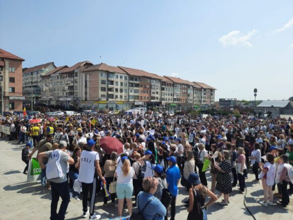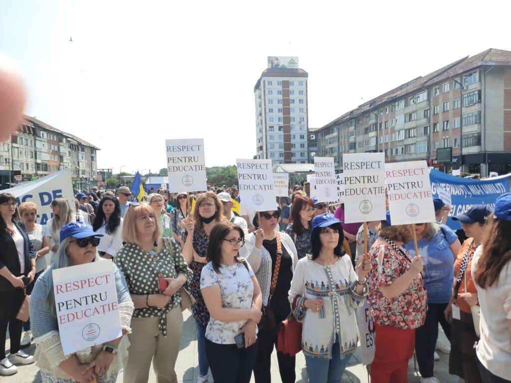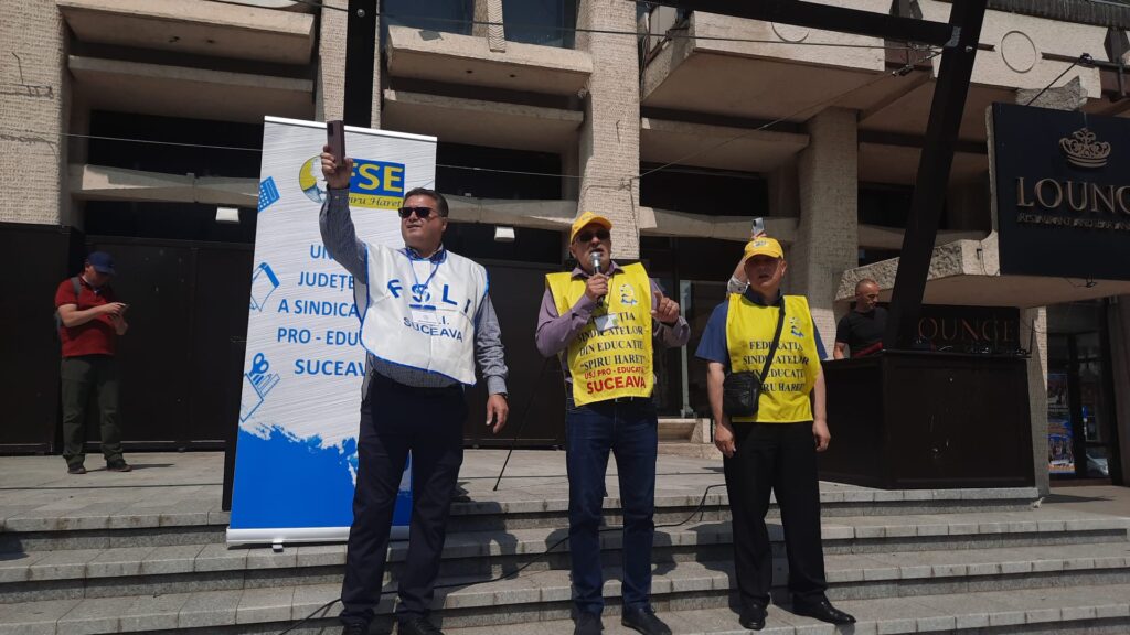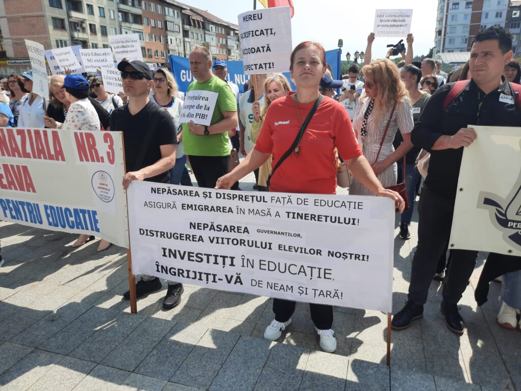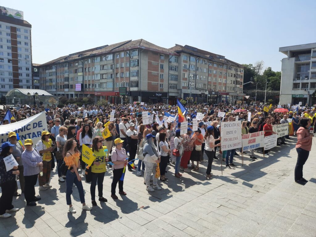 Cîteva mii de angajați din educație au protestat, astăzi, pentru a doua oară în ultimele zile pe esplanada Casei de Cultură din Suceava. Acțiunea are loc în cadrul grevei generale din învățămînt. La protest au participat angajați din unități precum Școala Gimnazială „Miron Costin” din Burdujeni, Școala Gimnazială nr. 3, Colegiul Economic <Dimitrie Cantemir> din Suceava, dar și de la școli din localități limitrofe municipiului reședință de județ. Protestatarii aveau pancarte cu mesaje de genul <Educația, Cenușăreasa sistemului>, <Respect pentru educație> sau <Fără educație moare orice nație>. Manifestanților li s-au adresat liderii ASIS și „Pro-Educația”, Giani Leonte, respectiv Traian Pădureț. Noi proteste sînt programate pentru mîine și poimîine.