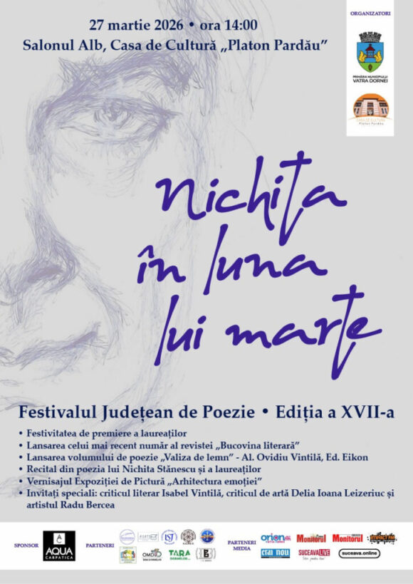Pe 27 martie, la Vatra Dornei, va avea loc cea de-a 17-a ediție a Festivalului Județean de Poezie ”Nichita în luna martie”. Evenimentul este organizat de Primăria Municipiului Vatra Dornei, prin Casa de Cultură „Platon Pardău”, în parteneriat cu Societatea Scriitorilor Bucovineni, Inspectoratul Județean Școlar Suceava, Centrul Cultural ”Bucovina”, Biblioteca Bucovinei ”I.G. Sbiera”, Direcția Județeană pentru Cultură Suceava și Asociația Scriitorilor și Artiștilor din Țara Dornelor. Festivalul va avea loc la Salonul Alb al Casei de Cultură „Platon Pardău”, de la ora 14.00.