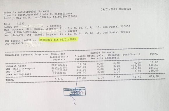 Primarul Sucevei, Ion Lungu, a anunțat că a fost primul cetățean al municipiului care a plătit dările locale pentru anul în curs. Acesta a plătit în contul impozitului pe teren, pe mijloacele de transport și pe clădiri, și pentru taxa de ecologizare 679,60 lei. Primarul a spus: ”Plata am efectuat-o cu cardul la unul din POS-urile instalate la primărie. Am beneficiat de bonificația de 10% la impozitul pe apartament și cele două mașini. Plata se poate face la ghișeele primăriei cu numerar/card, prin virament bancar sau electronic prin aplicația www. ghișeul.ro. Programul de plată zilnic este intre orele 8.00-18.00”.