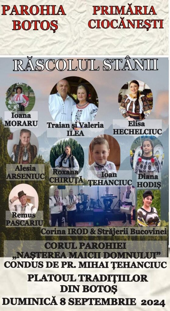 Parohia Botoș și Primăria Ciocănești organizează duminică, 8 septembrie 2024, pe Platoul Tradițiilor din Botoș, <Răscolul Stînii>.