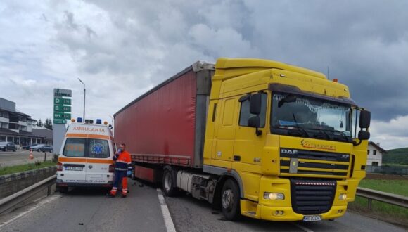 Ambulanța a intrat în coliziune ușoară cu un tir care venea din sens opus.