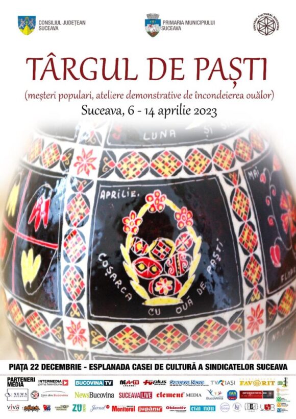 Între 6 și 14 aprilie, pe esplanada Casei de Cultură din Suceava va fi deschis Tîrgul de Paști. Evenimentul este organizat de Consiliul Județean prin Centrul Cultural „Bucovina”. Tîrgul are ca scop promovarea şi valorificarea meşteşugului de încondeiere a ouălor în Bucovina, precum și a altor meșteșuguri din zonă, dar și coordonarea şcolilor de încondeiere din judeţ. Meșterii vor face demonstrații în cadrul unor ateliere.