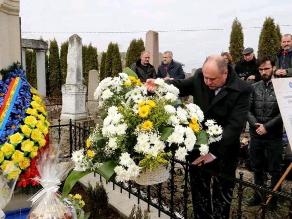 Un coș de flori din partea administrației sucevene, depus la mormîntul lui Dimitrie Onciul de la Cernăuți