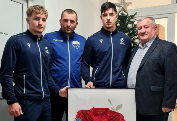 Un tricou și o minge de rugby din partea a doi tineri jucători născuți la Cornu Luncii, pentru primarul Gheorghe Fron