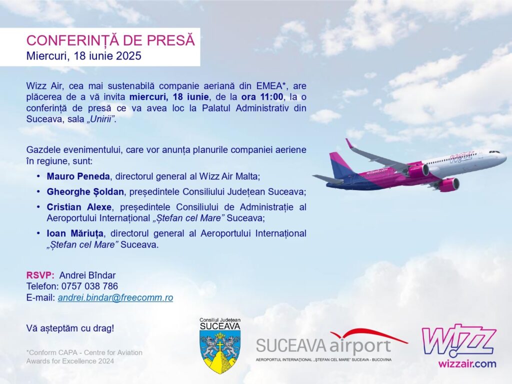 Consiliul Județean Suceava anunță că miercuri, 18 iunie, compania aeriană Wizz Air va anunța la Suceava care sînt planurile sale pentru regiunea de Nord-Est a Țării. O va face în cadrul unei conferințe de presă care va începe la ora 11.00 și va fi găzduită de Sala Unirii a Palatului Administrativ.