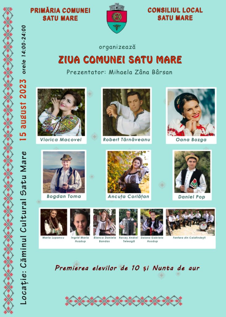 Pe 15 august, de Ziua comunei sucevene Satu Mare, Primăria va premia 20 de elevi de 10 și cinci cupluri de aur. De asemenea, va avea loc un spectacol folcloric. Pe scenă vor urca, printre alții, Viorica Macovei, Robert Tîrnăveanu, Oana Bozga, Bogdan Toma, Ancuța Corlățan, Daniel Pop și Fanfara din Calafindești. Spectacolul va fi prezentat de Mihaela Zîna Bîrsan, inițiatoarea proiectului „10 pentru folclor”. Evenimentele se vor desfășura la Căminul Cultural din Satu Mare, între orele 14.00 și 24.00.