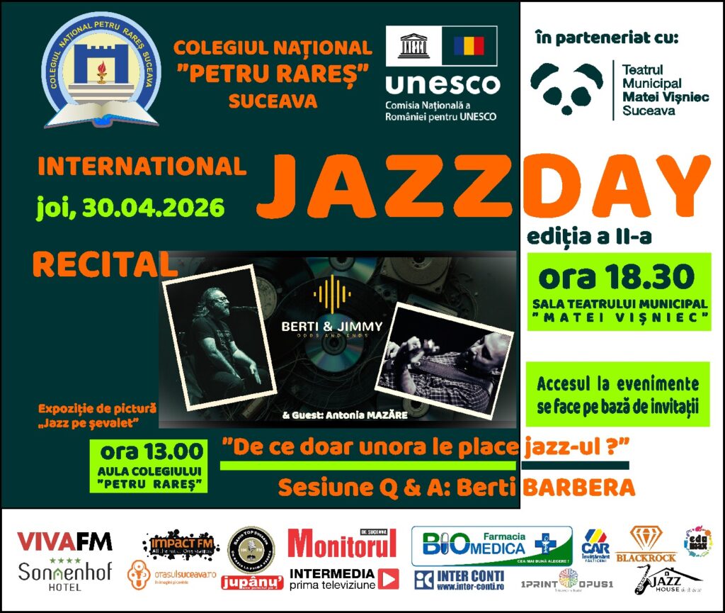 Colegiul Național ”Petru Rareș” din Suceava marchează, pe 30 aprilie, Ziua Internațională a Jazzului prin cea de-a doua ediție a proiectului ”De ce doar unora le place jazzul?”. Evenimentul se va desfășura sub patronaj UNESCO, cu accent pe implicarea directă a elevilor în actul artistic.