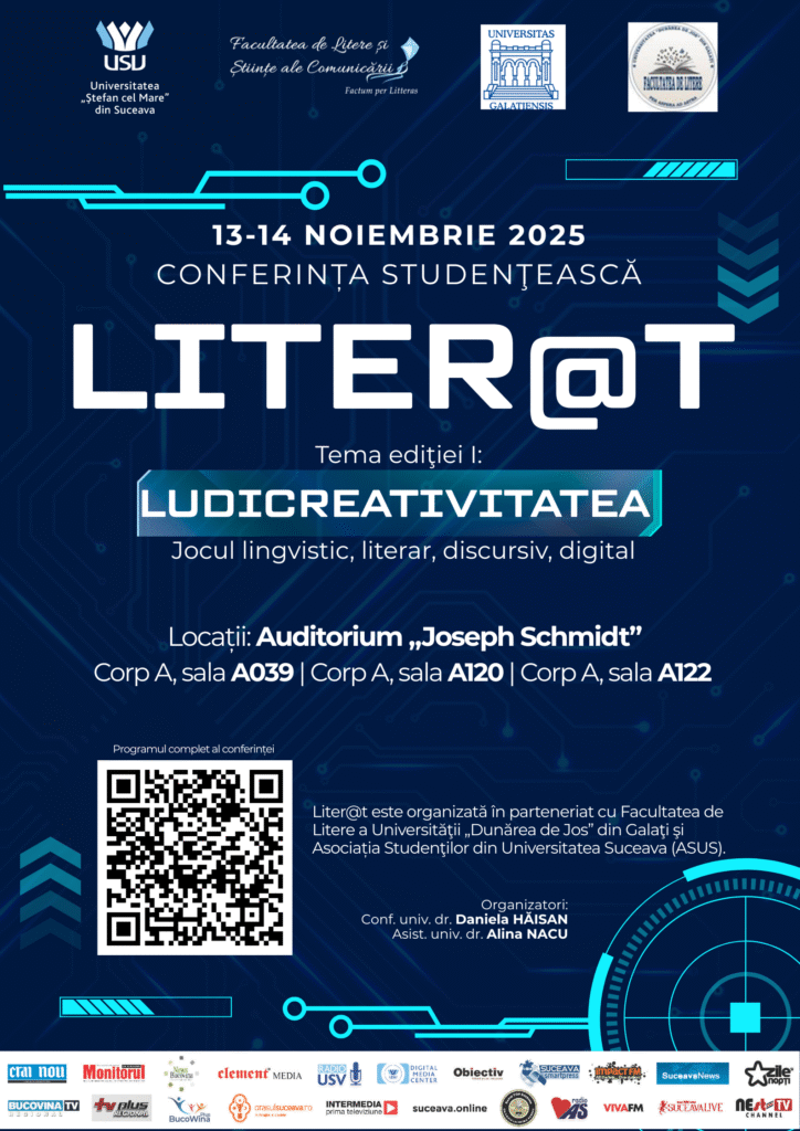 Pe 13 și 14 noiembrie, Facultatea de Litere și Științe ale Comunicării Suceava, în parteneriat cu Facultatea de Litere a Universităţii „Dunărea de Jos” din Galaţi şi Asociația Studenţilor din Universitatea Suceava (ASUS), organzează prima ediție a conferinței studențești Liter@t.