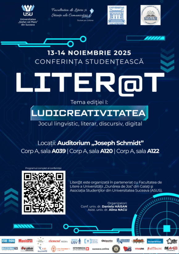 Intitulată LUDICREATIVITATEA (Jocul lingvistic, literar, discursiv, digital), conferința se va bucura de prezența a peste 100 de studenți din domeniile Filologie, Comunicare şi relaţii publice, Media digitală și Jurnalism din șase centre universitare. Acestea sînt Universitatea „Dunărea de Jos” din Galaţi, Universitatea din Bucureşti, Universitatea „Alexandru Ioan Cuza” din Iaşi, Universitatea „Babeş-Bolyai” din Cluj-Napoca, Universitatea de Medicină, Farmacie, Ştiinţe şi Tehnologie „George Emil Palade” din Târgu Mureş și Universitatea „Ştefan cel Mare” din Suceava. Studenții vor prezenta lucrări în limbile română, engleză, franceză, spaniolă și italiană.
