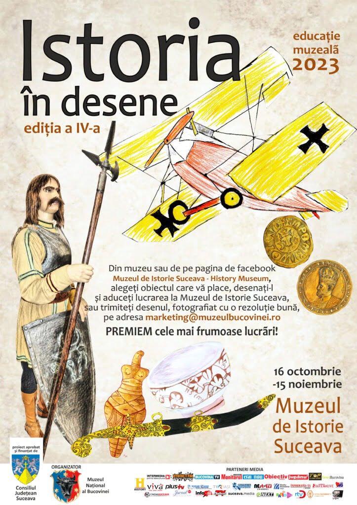 Muzeul Național al Bucovinei a lansat cea de-a IV-a ediție a proiectului de educație muzeală <Istoria în desene>. Atelierul de creativitate se adresează copiilor și tinerilor cu vîrste cuprinse între 8 și 18 ani. Aceștia sînt invitați să creeze desene inspirate de obiectul preferat ales din patrimoniul Muzeului de Istorie. Scopul proiectului vizează promovarea patrimoniului instituției muzeale din expoziția permanentă și din cele temporare. Desenele trebuie să conțină numele autorului, vîrsta, școala și localitatea. Lucrările vor fi duse în perioada 16 octombrie – 15 noiembrie la Muzeul de Istorie sau pot fi trimise prin email la adresa marketing@muzeulbucovinei.ro. Toate desenele vor fi postate pe pagina de Facebook a Muzeului de Istorie, iar cele mai frumoase vor fi premiate. Selecția va fi realizată de o comisie formată din specialiștii Biroului Educație, Marketing și Comunicare. Premiile constau în cărți și se vor acorda la două categorii de vîrstă: 8-12 ani, respectiv 13-18 ani.