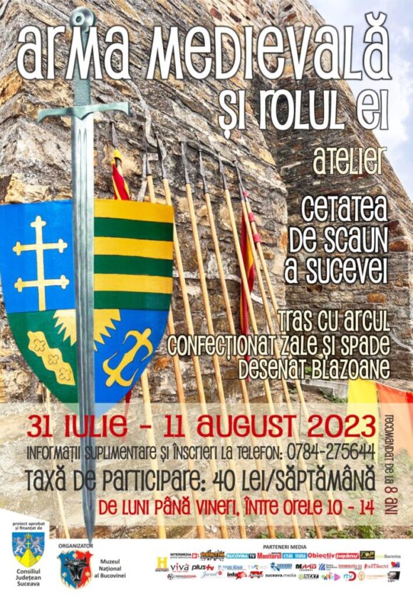 În perioada 31 iulie – 11 august, Cetatea de Scaun a Sucevei va găzdui activitatea educativă „Arma medievală și rolul ei”, destinată copiilor cu vîrste cuprinse între 8 și 15 ani. Atelierul este structurat pe două perioade: 31 iulie – 4 august și 7 – 11 august, iar taxa de participare este de 40 lei/săptămînă de luni pînă vineri, în intervalul orar 10.00 – 14.00. Grupa de lucru la atelier trebuie să fie de minim 10 participanți. În cadrul atelierului se vor desfășura activități teoretice și practice vizînd arsenalul militar din Evul Mediu în Țările Române. Participanții vor confecționa replici ale unor arme albe și armuri medievale, cum ar fi spade, săgeți, arcuri, coifuri, cămașă cu zale și sulițe. De asemenea, copiii vor avea ocazia de a exersa tehnici de tras cu arcul sub îndrumarea unui specialist. Relații suplimentare se pot obține la Serviciul Cetatea de Scaun, Casa Custodelui, telefon 0784/275644.