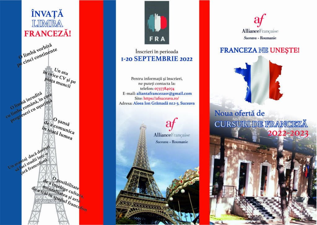 Alianţa Franceză din Suceava a transmis că începînd cu data de 3 octombrie se va desfășura o nouă sesiune de cursuri destinate publicului larg. Cursurile de limba franceză se adresează tuturor categoriilor de public și tuturor vîrstelor. Funcție de preferințe și de disponibilitatea lor, cursanții adulți pot opta atît pentru cursuri față în față, cît și pentru cursuri în regim online. Cursurile în format fizic au loc la Școala Gimnazială nr. 1 din Suceava, cu respectarea regulilor sanitare în vigoare. Înscrierile se fac exclusiv online pînă marți, 20 septembrie. Pentru înscrieri şi informaţii suplimentare, puteți consulta site-ul afsuceava.ro sau contacta direct secretariatul Alianţei Franceze la adresa de mail aliantafrancezasv@gmail.com ori la numărul de telefon: 0737/784074, de luni pînă vineri, în intervalul orar 10.00-18.00.
