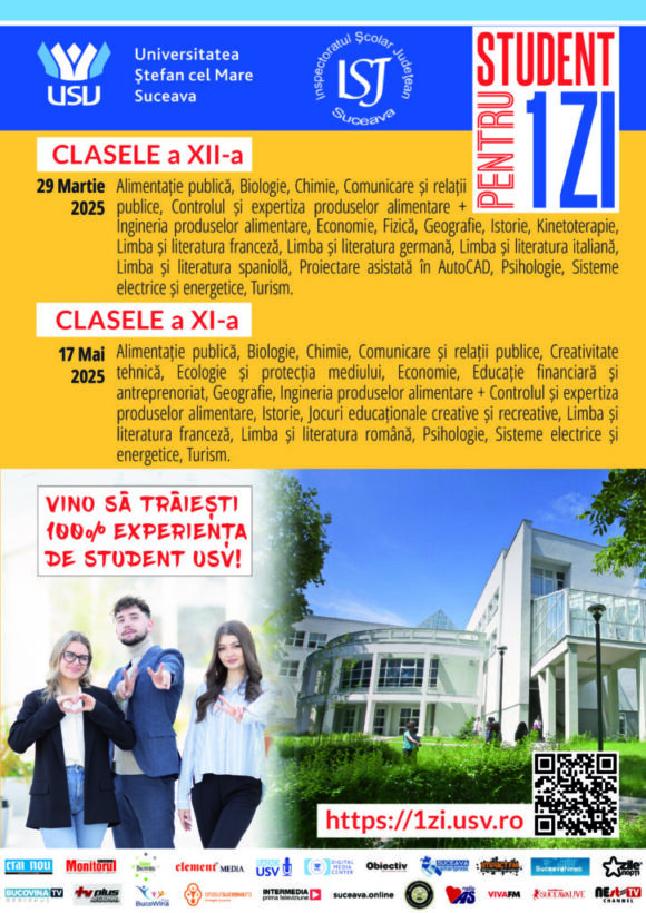 Universitatea „Ștefan cel Mare” din Suceava, în parteneriat cu Inspectoratul Școlar Județean Suceava, organizează cea de-a XIV-a ediție a Concursului interjudețean „Student pentru o zi”. Evenimentul se va desfășura sub forma unui concurs individual pentru elevii claselor a XII-a, în ziua de 29 martie 2025, și sub forma unui concurs pe echipe pentru elevii claselor a XI-a, în ziua de 17 mai 2025.