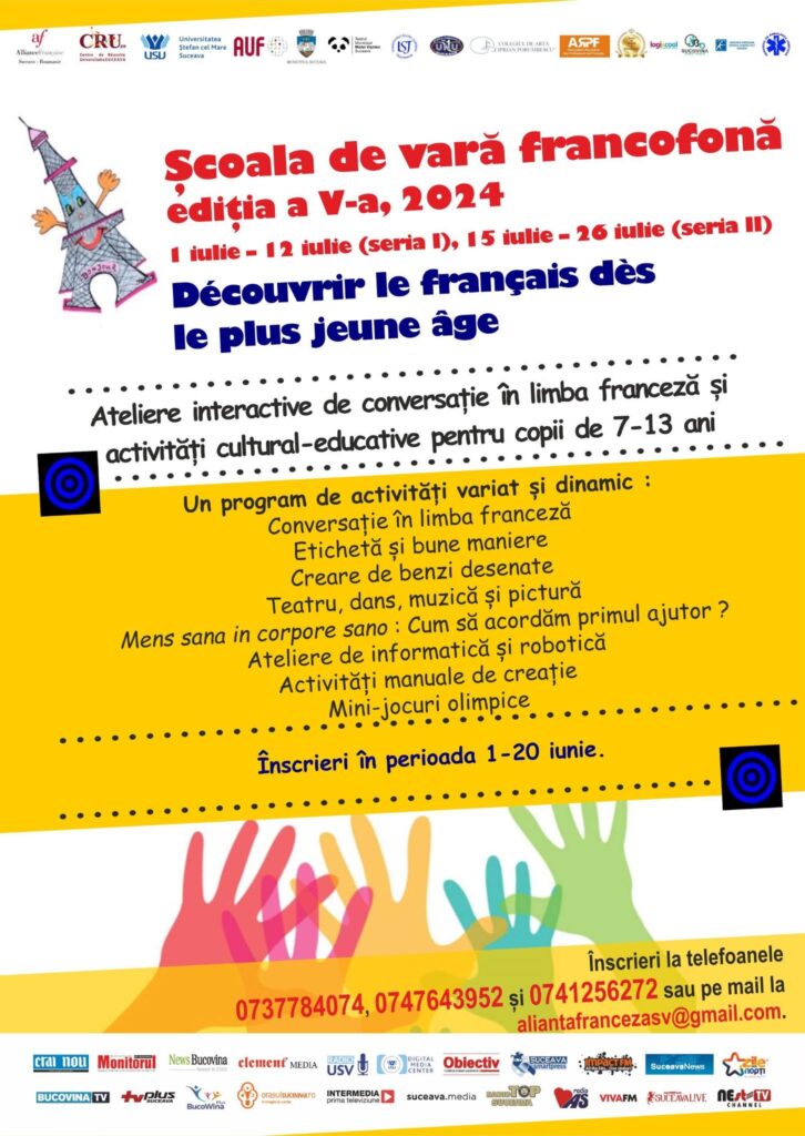 Alianţa Franceză din Suceava, în colaborare cu Centrul de Reușită Universitară al Universității <Ștefan cel Mare> din Suceava și Agenția Universitară a Francofoniei, organizează cea de-a V-a ediţie a școlii de vară francofone în cadrul proiectului <Découvrir le français dès le plus jeune âge”>/, <Să descoperim limba franceză de la o vârstă fragedă>, pentru elevi cu vîrste cuprinse între 7 și 13 ani.