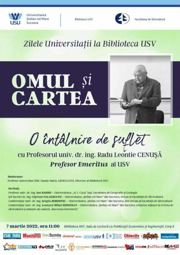 - Luni, 7 martie, începînd cu ora 11.00, la Universitatea „Ștefan cel Mare” din Suceava se va desfășura o întîlnire cu profesorul universitar doctor inginer Radu Leontie Cenușă, cercetător și Professor Emeritus al USV. Moderator va fi directorul Bibliotecii USV, profesorul universitar doctor Sanda-Maria Ardeleanu. Invitați sînt profesorul universitar doctor Ion Barbu de la Universitatea „Al. I. Cuza” din Iași, precum și șeful de lucrări dr. ing. Ciprian Palaghianu, conf. univ. dr. ing. Sergiu Horodnic și conf. univ. dr. ing. Leonard Mihai Duduman de la Universitatea „Ștefan cel Mare”. Cu prilejul evenimentului din 7 martie, Biblioteca USV va organiza o expoziție de carte și periodice. Profesorul și cercetătorul Radu Leontie Cenușă s-a născut în data de 21 iunie 1951, la Vatra Moldoviței.