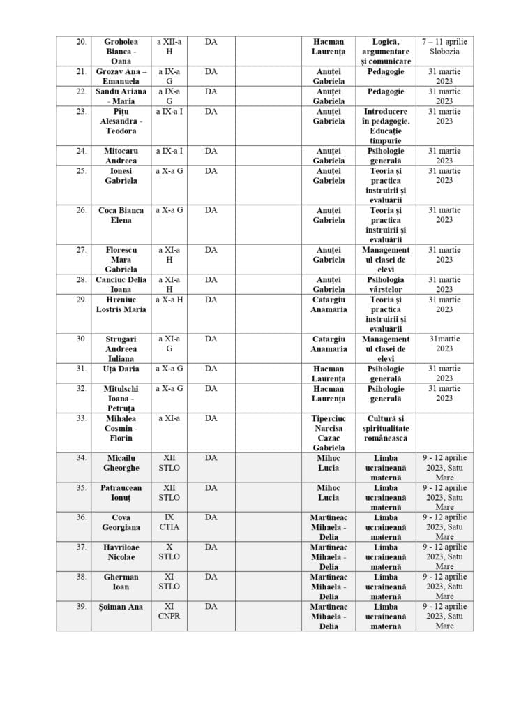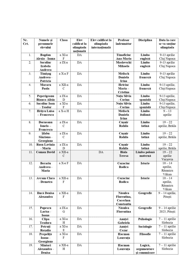 Directoarea Colegiului Național „Mihai Eminescu” Suceava, Silvia-Corina Nuțu, este extrem de încîntată de faptul că 33 de elevi ai unității pe care o conduce s-au calificat la etapele naționale ale diverselor olimpiade școlare. Într-o emisiune la Radio Top, profesoara a declarat că elevii colegiului s-au comportat foarte bine la fazele județene ale olimpiadelor și a apreciat că, din cîte știe, numărul calificaților la <naționale> este cel mai mare al unei școli sucevene. Numele elevilor calificați și ale profesorilor care îi pregătesc le găsiți în documentele atașate.