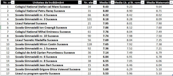 Școala din municipiul Suceava cu cele mai bune medii la Evaluarea Națională este Colegiul Național ”Ștefan cel Mare”, cu media 9,43. Pe locul II s-a clasat Colegiul Național ”Petru Rareș”, cu 8,80, iar pe III Școala Gimnazială nr. 4, cu 8,22. Astfel, Școala 4 este prima în topul școlilor gimnaziale. Conform directorarei adjuncte a Școlii 4, Mariana Ciupu, mediile la sesiunea 2022 a Evaluării Naționale au fost calculate de profesoarele Alina Serhei și Emilia-Alina Fodore, membre ale Consiliului de Administrație al Școlii Gimnaziale nr. 4.