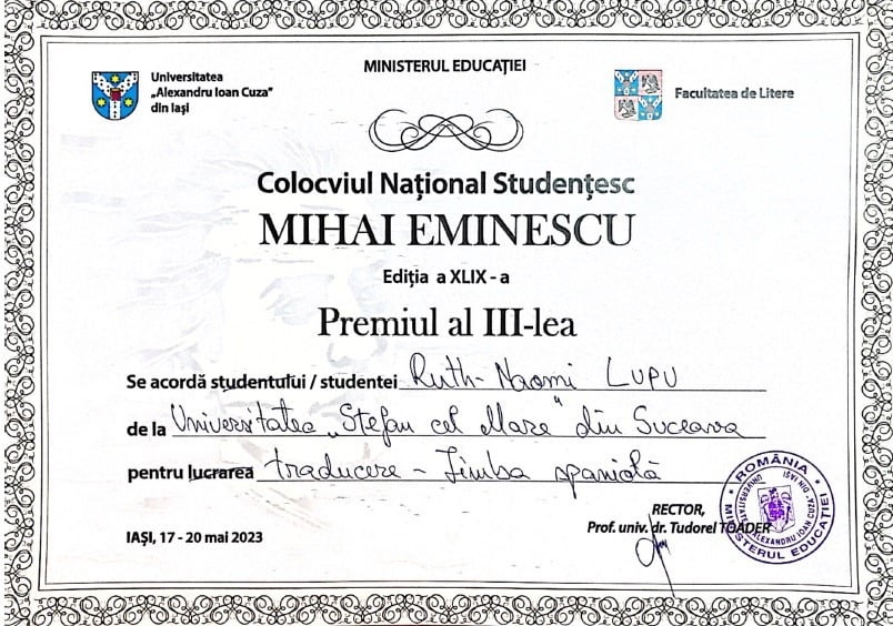 Ca în fiecare an, studenţii de la Facultatea de Litere şi Știinţe ale Comunicării din cadrul Universităţii „Stefan cel Mare” din Suceava se află printre cîştigătorii uneia dintre cele mai cunoscute manifestări ştiinţifice studenţeşti cu profil filologic din România. Este vorba despre Colocviul Naţional Studenţesc „Mihai Eminescu” de la Iași. La secțiunea de traduceri, premiul III a fost obținut de studenta Ruth Naomi Lupu din anul II, de la specializarea limba și literatura engleză – limba și literatura spaniolă, pentru traducerea în limba spaniolă a poemului eminescian „Noi amîndoi avem acelaşi dascăl”. Menţiunea a fost cîştigată de studenta Anca Diana Istrate din anul II, de la specializarea Conversie Limba și literatura spaniolă. Anca Istrate a tradus în limba spaniolă poezia „Cărţile”. Pe de altă parte, studenta Simona Rodica Vasîlciuc din anul III, de la specializarea Limba și literatura franceză – Limba și literatura spaniolă, a cîștigat o mențiune la Concursul Național de Traducere „La Voz a Ti Debida”. Simona Vasîlciuc a primit mențiunea pentru traducerea din limba spaniolă în limba română a trei texte, două în versuri și unul în proză. Competiția a fost organizată de Departamentul de Limbi și Literaturi Romanice, Clasice și Neogreacă al Universității din București, cu spriijinul Institutului Cervantes, al Ambasadei Spaniei și al revistei Observator Cultural. Toate cele trei studente sucevence sînt coordonate de lectorul universitar doctor Alina-Viorela Prelipcean.