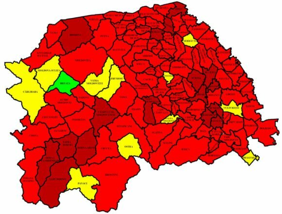 102 din cele 114 localități, în roșu. În municipiul Suceava, rata de infectare este de 16,06 la mie. Cea mai mare rată, la Siret – 20,67