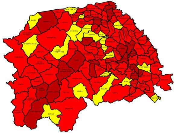 Din cele 114 localități, 94 sînt în roșu. În municipiul Suceava rata a scăzut de la 18,17 la 17,98. Cea mai mare rată de infectare, la Șcheia – 19,60. 186 de paturi de spital, libere