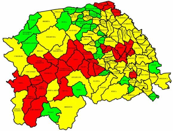 Județul Suceava, în galben, după ce rata de infectare a coborît la 2,98 la mie. Doar 27 din cele 114 localități mai sînt în roșu