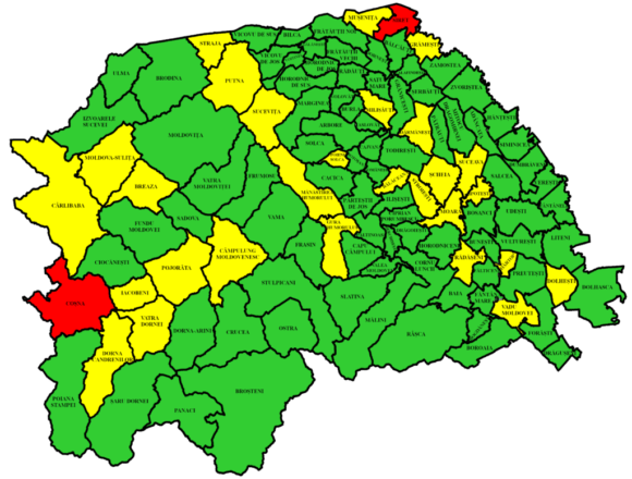 În județul Suceava au fost raportate 20 de cazuri noi de coronavirus, cu 20 în minus față de ziua anterioară, după ce s-au făcut 700 de teste. Numărul cazurilor active a scăzut de la 256 la 237, iar incidența s-a redus de la 1,12 la 1,04 la mia de locuitori. Cu 92 de cazuri în evoluție și o incidență de 2,12, municipiul Suceava se menține în „zona galbenă”. Dintre municipii, în „galben” mai sînt Vatra Dornei, cu 1,97, și Cîmpulungul, cu 1,90. Rădăuțiul și Fălticeniul se află în „zona verde”, cu incidențe de 0,95 și, respectiv, 0,97. În „roșu”, cu o rată de infectare de peste 3, se mențin două localități: orașul Siret și comuna Coșna. Din cele 114 localități, 54 nu au nici un caz activ de COVID, 33 au cîte un caz, 18 sub cinci, 6 sub zece, iar 3 au peste zece cazuri în evoluție. În altă ordine de idei, astăzi dimineață, în spitalele sucevene se aflau internate 69 de persoane diagnosticate cu COVID, din care 9 copii și 26 suspecte de infecția cu noul coronavirus. La nivelul județului erau 261 de locuri libere COVID, din care 22 pentru copii și 40 pentru zona tampon.