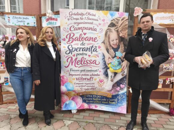 Creșa nr. 1 Suceava și Grădinița din Obcini au organizat, astăzi, campania „Baloane de Speranță pentru Melissa”, în vederea strîngerii de fonduri pentru ajutorarea unei fetițe de 8 ani care are nevoie de tratement în Elveția. Melissa suferă de epilepsie, tetrapareză spastică și paralizie cerebrală. Prin achiziționarea unui balon sau a produselor alimentare făcute de părinții și bunicii copiilor, fiecare dintre cei prezenți a putut contribui la această cauză. Printre cei care au fost alături de organizatori s-a numărat subprefectul Bogdan George Păstrăv. Acesta a declarat: ”Am fost prezent, în calitate de subprefect, la acțiunea caritabilă <Baloane de Speranță pentru Melissa>, organizată de Creșa nr. 1 Suceava. Un eveniment care ne reamintește cît de importantă este solidaritatea și implicarea fiecăruia dintre noi atunci cînd un copil are nevoie de sprijin. Melissa este un exemplu de curaj, iar împreună putem contribui la șansa ei la o viață mai bună. Felicit organizatorii, părinții și toți cei implicați pentru această inițiativă plină de suflet”.