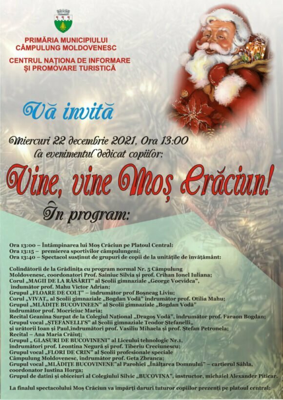 Moș Crăciun va ajunge și în acest an la Cîmpulung Moldovenesc, la invitația Primăriei și a Consiliului Local. Moșul va sosi pe platoul central miercuri, 22 decembrie, la ora 13.00, și va împărți 1.500 de cadouri la finalul unui spectacol care va debuta la ora 13.40. Va fi un spectacol susținut de grupuri de copii de la unitățile de învățămînt cîmpulungene. De la ora 13.15 vor fi premiați o serie de sportivi locali.