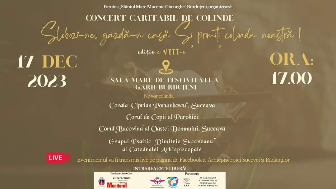Parohia Sfîntul Mare Mucenic Gheorghe Burdujeni organizează, cu binecuvîntarea Înaltpreasfințitului Părinte Arhiepiscop Calinic, cea de-a VIII-a ediție a concertului caritabil de colinde „Slobozî-ne gazdă-n casă și primiți colinda noastră”. Evenimentul va avea loc în Sala Mare de Festivități a Gării Burdujeni pe 17 decembrie 2023, începînd cu ora 17.00. Conform unui comunicat al organizatorului, ”participanții vor avea ocazia să se bucure de colinde interpretate de Corala <Ciprian Porumbescu> din Suceava, Corul <Bucovina> al Oastei Domnului, Corul de Copii al Parohiei și Grupul Psaltic <Dimitrie Suceveanu> al Catedralei Arhiepiscopale. Evenimentul va fi transmis live pe pagina de Facebook a Parohiei și pe pagina de Facebook a Arhiepiscopiei Sucevei și Rădăuților. În spiritul solidarității, parohia se implică în sprijinirea lui Mircea Tomiță, în vîrstă de 15 ani, olimpic internațional la informatică și robotică. Elev în clasa a IX-a la Colegiul Național <Ștefan cel Mare> din municipiul Suceava, Mircea provine dintr-o familie modestă, fiind crescut doar de mama sa aflată în șomaj. Casa în care locuiesc împreună cu bunica a fost afectată de un incendiu în vara acestui an”. Intrarea la eveniment este liberă.