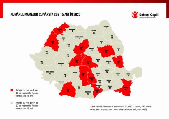 România dă aproape jumătate, mai exact 45%, din nașterile înregistrate în rîndul fetelor cu vârste mai mici de 15 ani în Uniunea Europeană. Conform organizației Salvați Copiii, în anul 2020, 731 de fete cu vîrsta sub 15 ani au devenit mame, în top fiind județele Mureș, cu 63 de mame cu vîrsta sub 15 ani, Bihor și Dolj, cu cîte 52, și Brașov, cu 40. În județul Suceava au fost 12 mame cu vîrsta sub 15 ani. Două din 10 mame adolescente au mai mult de un copil, iar 32% dintre acestea afirmă că mama lor era minoră cînd le-a născut, potrivit celei mai recente anchete realizate de Salvați Copiii România. Statistica arată că unu din zece nou-nӑscuţi din România provine din mame adolescente, ceea ce crește exponențial riscul de prematuritate și de mortalitate infantilă.