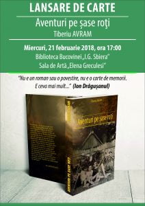 Redactorul șef al cotidianului „Monitorul de Suceava”, Tiberiu Avram, își va lansa cartea „Aventuri pe șase roți” la Biblioteca Bucovinei „I.G.Sbiera”. Evenimentul va avea loc miercuri, 21 februarie, începînd cu ora 17.00. Cartea semnată de Tiberiu Avram a apărut anul acesta la Editura Lidana şi a fost lansată în urmă cu cîteva zile la Gura Humorului, oraşul în care a locuit autorul pe vremea cînd era licean şi a pornit în aventura descrisă în carte.