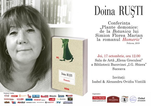 Mîine, de la ora 12.00, scriitoarea Doina Ruști va susține o conferință la Biblioteca Bucovinei „I. G. Sbiera” din Suceava. Conferința are tema „Plante demonice: de la Botanica lui Simion Florea Marian la romanul Homeric”. De asemenea, Doina Ruști își va lansa romanul „Homeric”, apărut anul acesta la Editura „Polirom”. Invitații evenimentului vor fi Isabel&Alexandru Ovidiu Vintilă.