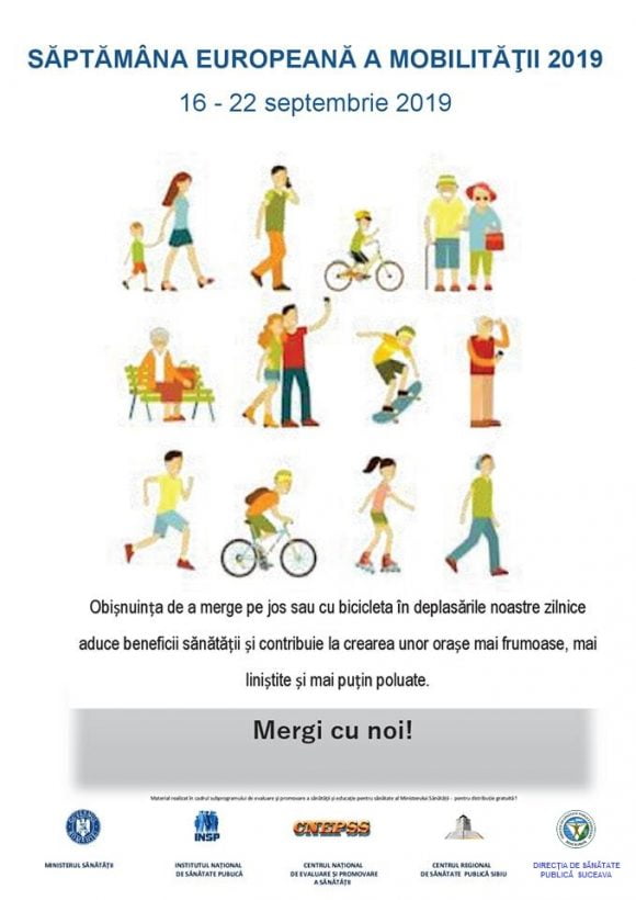 Direcţia de Sănătate Publică Suceava a transmis că în perioada 16-22 septembrie va marca, în parteneriat cu unitățile administrativ teritoriale cu asistență medicală comunitară, Săptămîna Europeană a Mobilităţii sub sloganul „Mergi cu noi!”. Tema campaniei din acest an este „Mersul pe jos și cu bicicleta în condiții de siguranță rutieră”, iar ziua de 22 septembrie este declarată „Ziua fără mașini!”. Actuala ediție a Săptămînii Europene a Mobilității încurajează oamenii să aleagă moduri active de deplasare: să combine mersul pe jos cu mersul cu bicicleta și cu mijloacele de transport public. Obiectivele campaniei vizează conștientizarea populației în vederea formării unor atitudini pozitive față de stilul de viață sănătos prin adoptarea mobilității alternative și prezentarea de alternative de mobilitate durabilă locuitorilor din mediul urban. Printre altele, la nivelul județului Suceava vor fi distribuite materiale informative privind beneficiile pentru sănătate ale mobilității alternative multimodale.