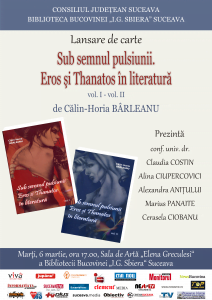 Lectorul universitar doctor Călin-Horia Bîrleanu, de la Facultatea de Litere și Științe ale Comunicării din cadrul universităţii sucevene, va lansa la Biblioteca Bucovinei „I. G. Sbiera” cercetarea în două volume „Sub semnul pulsiunii. Eros și Thanatos în literatură”. Evenimentul va avea loc marți, 6 martie, începînd cu ora 17.00. Lucrările vor fi prezentate de conferențiarul universitar doctor Claudia Costin, psihoterapeutul Alina Ciupercovici, artistul plastic Alexandra Anițului, filologul Marius Panaite și studenta Cerasela Ciobanu.